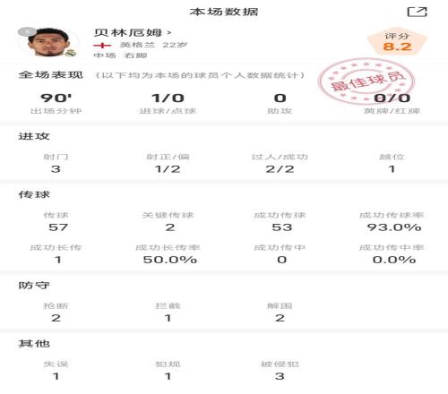 雷速体育10月23报道 在今天凌晨结束的皇马主场1-0尤文的欧冠比赛中,贝林厄姆打入制胜球帮助皇马力克尤文。