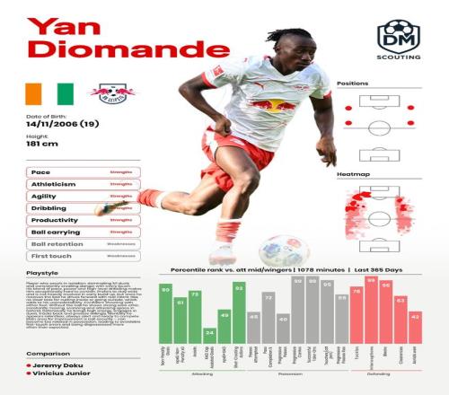 「我听说有几家英超俱乐部都在关注这孩子。」罗马诺说道,「他目前在莱比锡红牛表现非常出色,同时他还代表科特迪瓦参加了非洲国家杯比赛。这是一名极具天赋的边锋,既擅长盘带,速度也很快。所以他是一名非常出色的球员,拥有巨大的潜力,真是非常有趣的天才。所以我要告诉你们,不只是曼联和热刺关注他,但两队持续考察他的情况。」