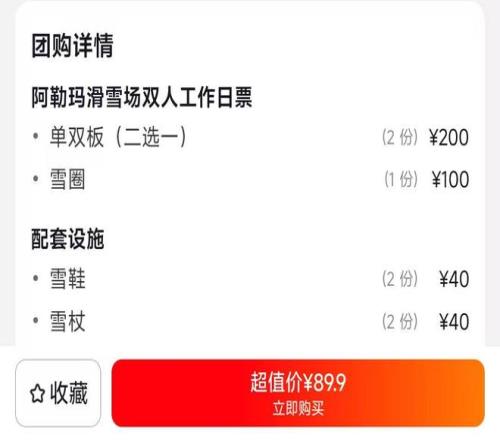 就拿滑雪入场券来说,只要打开团购平台,满眼都是原价288元的滑雪票只要48元,甚至还有滑雪场89.9元的门票中包含了2份雪板、一份雪圈、2份雪鞋、2份雪仗的促销信息,可以说这样的优惠力度让所有人在购买时毫无压力。